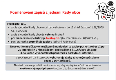 Je smutné, když paní starostka dovede obec do exekuce na základě své mylné interpretace skutečnosti. Je smutné, když svou mylnou interpretaci skutečnosti publikuje v obecním tisku, cpe ji do hlav všech, kteří jí věří, a dokonce ji uvádí v oficiálních odpovědích obce. Také stojí za pozornost oblíbený narativ, že POKROK přidělává obci práci. Trvalo 40 dní od podání žádosti, 7 vygenerovaných dokumentů a 4 kola pokusů získat odpověď, abychom se nakonec dozvěděli něco, co určitě není pravda. Přitom by stačilo psát a říkat pravdu. To POKROK dělá, ale u paní starostky na to bohužel nemáme žádný vliv.